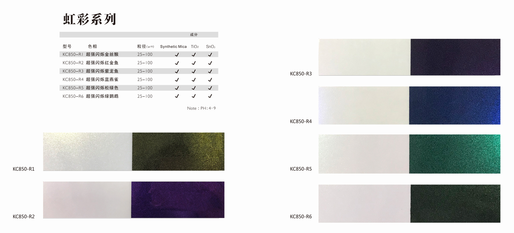 水晶龍系列珠光顏料具有超高的色彩飽和度,明亮耀眼的超強閃爍感,精密的包膜工藝,優良的分散性能。