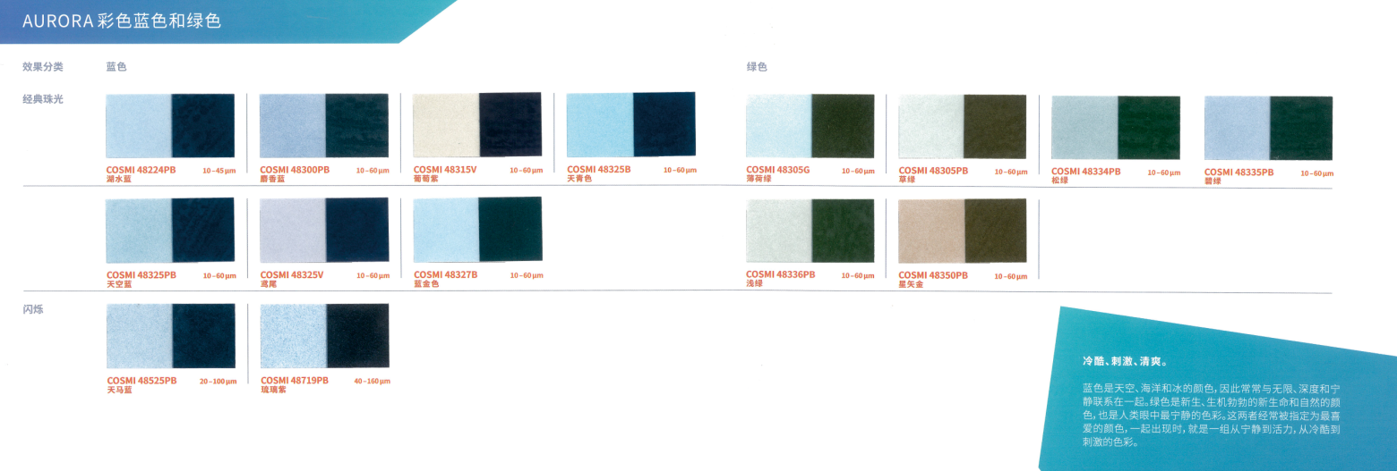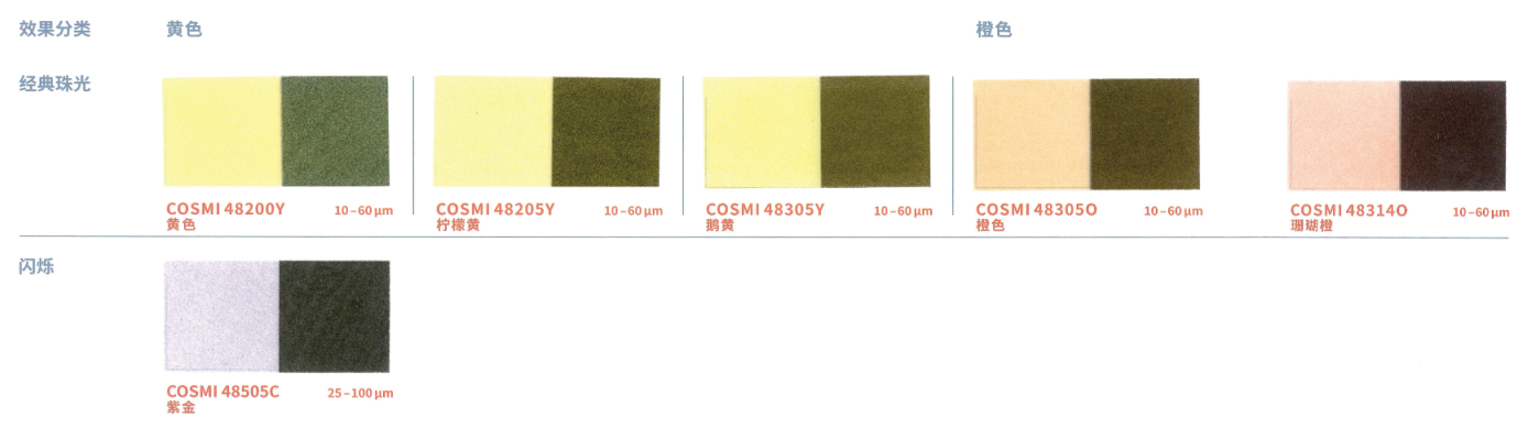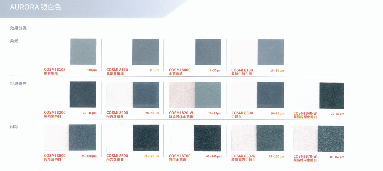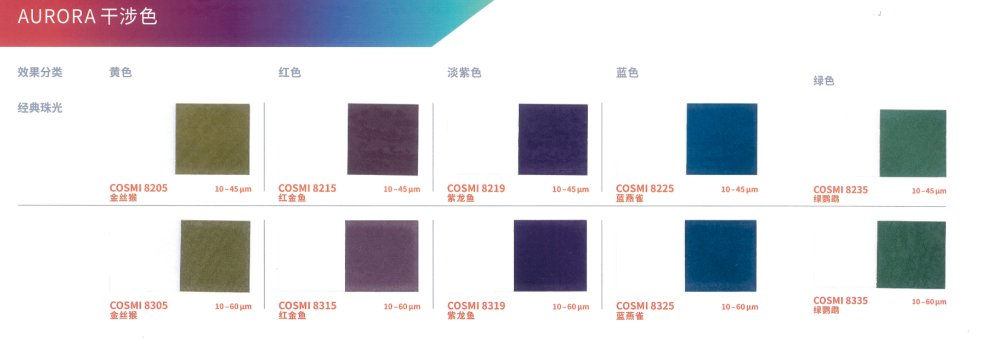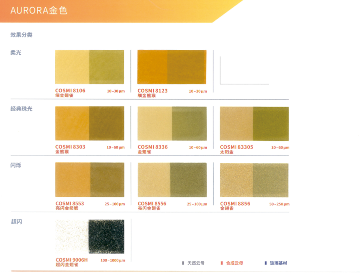 本產品采用合成云母基底,表面結構高度光滑規整,賦予其優異的光學性能。與CosPearl系列相比,其色彩表現更為純凈、鮮艷且閃耀,提供豐富色系選擇:包括經典銀白、干涉色、金色、金屬色,以及高飽和度的黃、橙、粉、紫、藍、綠、黑等強烈色彩,同時支持定制填料。產品具有高透明度與卓越的反射率,色度飽滿且穩定(多數Aurora系列珠光顏料呈現純白粉末基底,確保色彩還原度)。粒徑覆蓋小、中、粗多規格,可靈活適配不同妝效需求,廣泛適用于化妝品及個人護理產品的開發,尤其適合追求高顯色度與光澤感的配方設計。