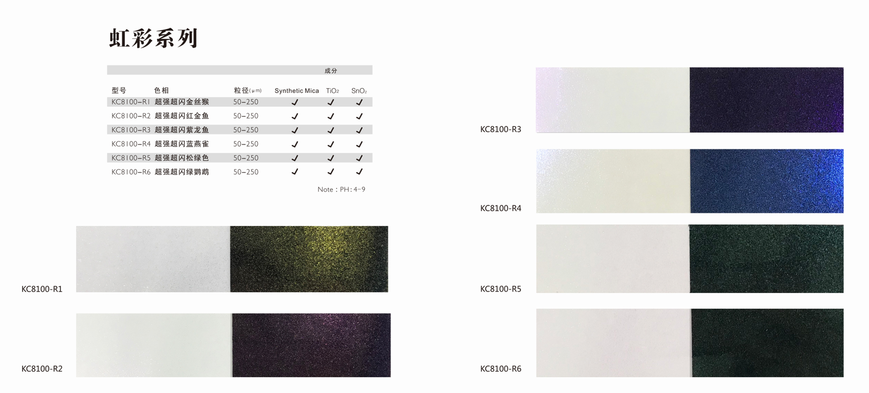 水晶龍系列珠光顏料具有超高的色彩飽和度,明亮耀眼的超強閃爍感,精密的包膜工藝,優良的分散性能。