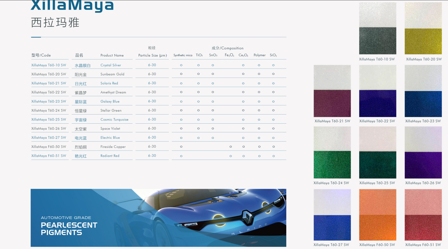 西拉瑪(ma)雅(ya)系列珠光(guang)顏(yan)料,以(yi)特殊硅鋁酸(suan)鹽片狀(zhuang)材料為基材、采用多種氧化物疊加包覆工(gong)藝技(ji)術(shu),將科學與視(shi)(shi)覺(jue)藝術(shu)完美(mei)的結合起來,給(gei)我(wo)們帶來一(yi)場(chang)視(shi)(shi)覺(jue)藝術(shu)盛宴。超(chao)強折射率、超(chao)高閃點(dian)、完美(mei)的色澤和遮蓋率,在光(guang)的作用下呈現出立體三維、層次豐(feng)富、質感優雅(ya)的視(shi)(shi)覺(jue)效果,一(yi)種特別的品(pin)質感便油然而生。