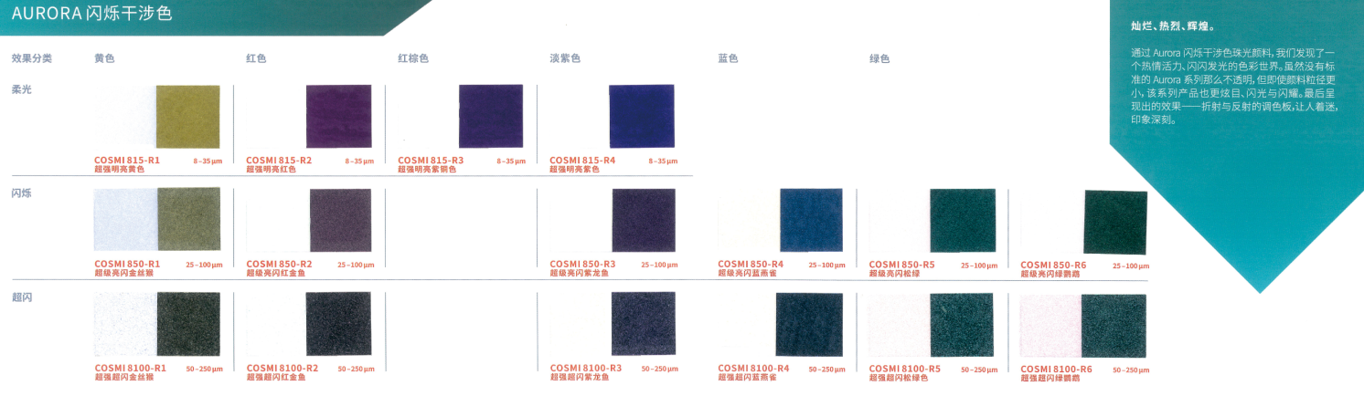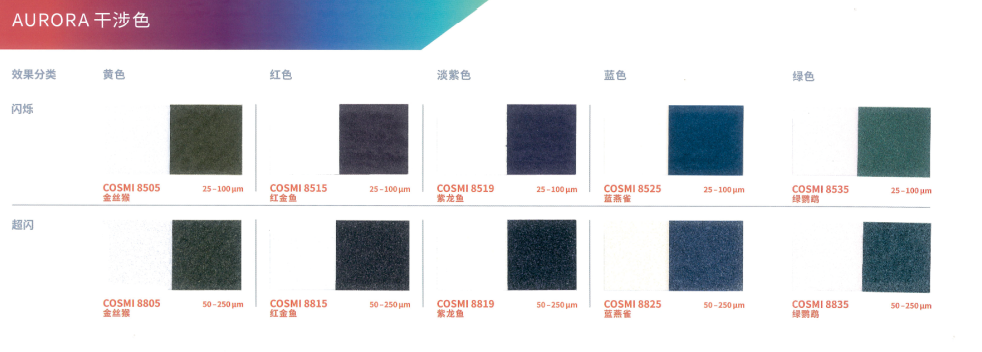 本產品采用合成云母基底,表面結構高度光滑規整,賦予其優異的光學性能。與CosPearl系列相比,其色彩表現更為純凈、鮮艷且閃耀,提供豐富色系選擇:包括經典銀白、干涉色、金色、金屬色,以及高飽和度的黃、橙、粉、紫、藍、綠、黑等強烈色彩,同時支持定制填料。產品具有高透明度與卓越的反射率,色度飽滿且穩定(多數Aurora系列珠光顏料呈現純白粉末基底,確保色彩還原度)。粒徑覆蓋小、中、粗多規格,可靈活適配不同妝效需求,廣泛適用于化妝品及個人護理產品的開發,尤其適合追求高顯色度與光澤感的配方設計。