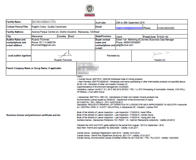 2016年巴西天然云母供應商經第三方獨立審核機構Bureau Veritas核查報告